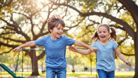 Two happy children are depicted running outdoors in a park-like setting. They are wearing blue shirts and jeans, with arms extended. The image uses warm, natural lighting and a shallow depth of field, set against a backdrop of trees. It is suitable for various commercial uses related to childhood, happiness, and outdoor recreation.