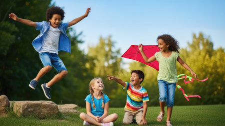 A group of children are shown playing outdoors in a park. One child is jumping in the air while others are looking up towards a red kite. The scene is illuminated by natural sunlight, with grass and trees visible in the background. This image is suitable for various commercial uses, including advertising and editorial content.