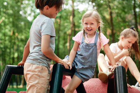 Happy childhood girls and boys from elementary school who play and frolic having good time with best friends and getting positive emotions from communicating with peers be on lawn of sunny park