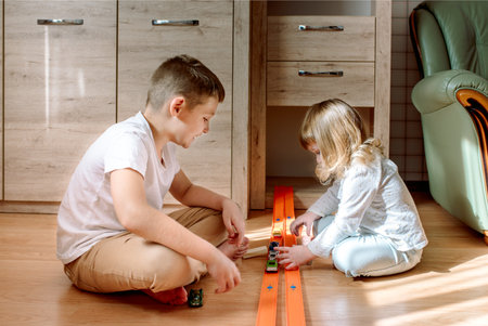Children play at home, elder brother and curly cute baby girl play cars on the floor.
