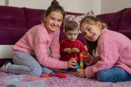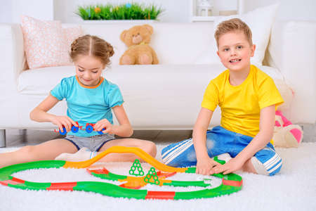 Children play with a toy designer on the floor of the childrens room. Two kids playing with colorful blocks. Kindergarten educational games