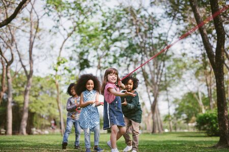 A group of diverse children are engaged in playful activity outdoors, displaying expressions of joy and laughter. The image showcases a natural daylight setting with a blurred background suggesting a park or recreational space. This photograph is potentially suitable for various commercial uses, including advertising and educational materials.