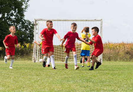 Kids Running in a Sports Team. Happy Football Team on Practice Unit. Football Sports Summer Camp for School Kids. Boys in Soccer Cleats and Jerseys