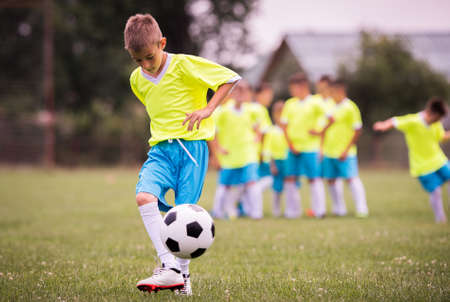 Child Kicking Soccer Ball on Green Field – Kids Football Training, Junior Sports Practice and Youth Soccer Match Preparation
