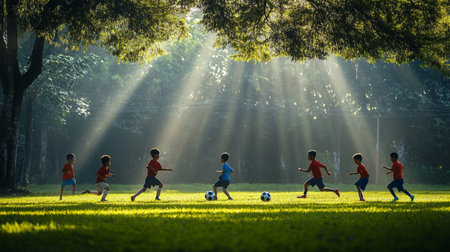 An aged, textured soccer ball lies on lush grass, while energetic kids chase and laugh under bright sunlight, capturing a lively outdoor sports scene.