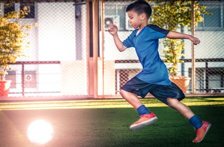 Little boy is kicking a soccer ball in sport training session with motion blur and light effect.