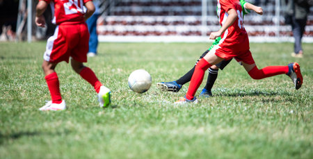 Selective focus to football ball with kid soccer players kick it on football field. Soccer player playing for football match. Kid futsal player.