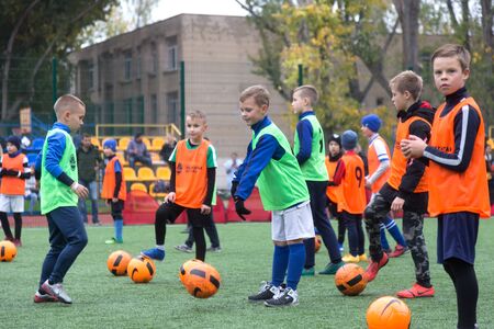 ODESSA, UKRAINE October 26, 2019: FC SHAKHTAR SOCIAL program for development of children's football sports, healthy lifestyles. Younger kick soccer on green futsal field during soccer festival
