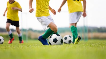 Soccer camp for kids. Boys practice dribbling in a field. Players develop good soccer dribbling skills. Children in yellow shirts training with balls. Soccer slalom drills on pitch