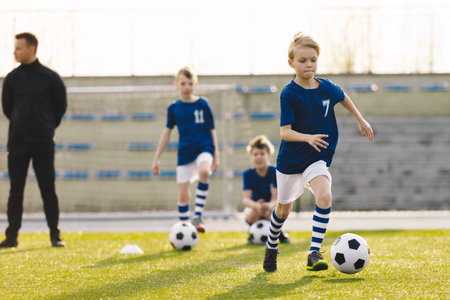 Young soccer players, boys in purple uniforms practicing dribbling exercises, focusing on ball control. Children training soccer outdoors