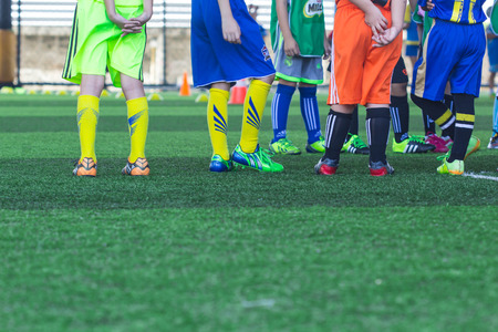 Bangkok,Thailand - September 19th, 2016: Boy team football thailand in green grass with background Training children in Soccer academy