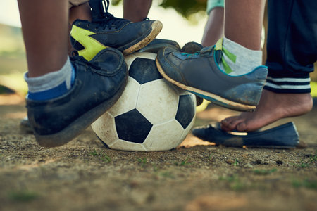 Close Up Shot : Young Boy Stopping a Ball with his Foot. Young Football Players Getting Ready to play Soccer in Neighborhood Pitch. Enjoying Childhood with Sports, Action and Happy Friendships