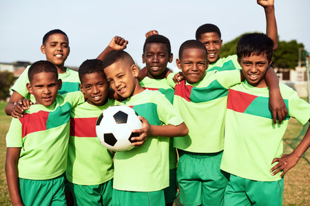 Dream, believe, achieve. Portrait of a boys soccer team standing together on a sports field.