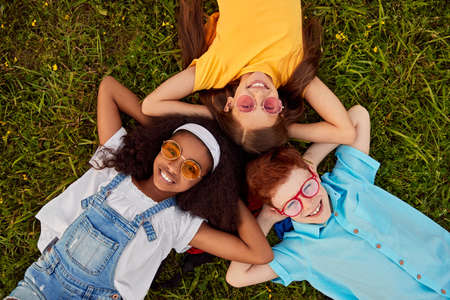 Happy childhood girls and boys from elementary school who play and frolic having good time with best friends and getting positive emotions from communicating with peers be on lawn of sunny park
