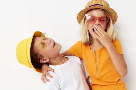 Children boy and girl brother and sister playing with cameras. Family relations concept.