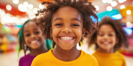 Three happy children smile brightly while standing together in a lively indoor amusement area filled with colorful lights and decorations, enjoying their time together.