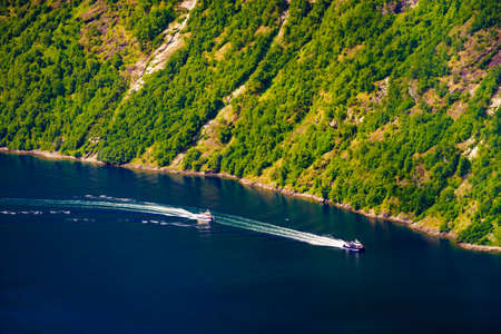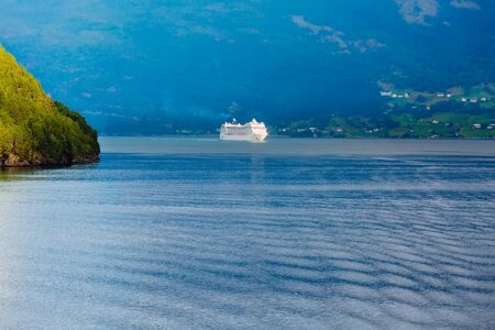 Tourism vacation and travel. Mountains landscape and cruising ship on fjord in Norway Scandinavia.