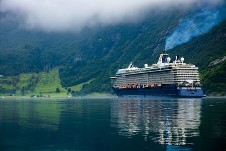 Norway - January 25, 2010: cruiser ship or liner in fjord, bay or harbor, calm water surrounded by mountains on rocky sea shore covered with green trees on summer day on cloudy white sky