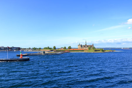 Helsingor, Denmark - July 23, 2019: View from the Baltic Sea of city. Helsingor is danish city in the northeast of Zealand, located 40 km north of Copenhagen on the Oresund Strait