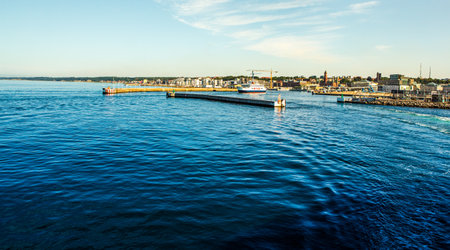 Modern ferry enters the port of Rostock. The ferry line connects to the German port of Rostock with Gedser in Denmark