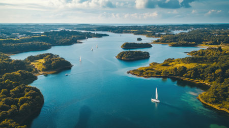 A serene view of a calm lake with sailboats gliding among lush green islands and trees under a bright blue sky in the afternoon light.
