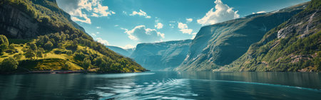 Stunning Views of Geirangerfjord in Norway, Calm Waters Reflecting Green Mountains and Misty Skies