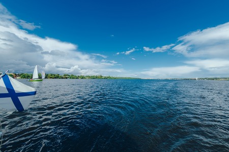 View from the board of a sailing yacht on the waters, sailing ships and the forest growing along the coast, as well as people's homes. Expanse of water reservoirs, beautiful cloud drifting over the water