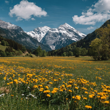 Mountain meadow with yellow dandelions and snow-capped Alps in background