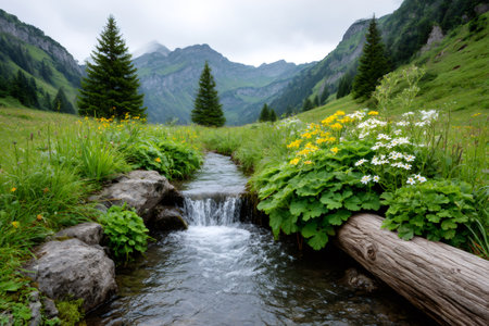 Crystal clear water flowing through a green meadow in the Swiss Alps with yellow and white wildflowers