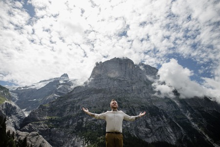 low angle view of handsome young man standing with open arms in beautiful mountains, Alps