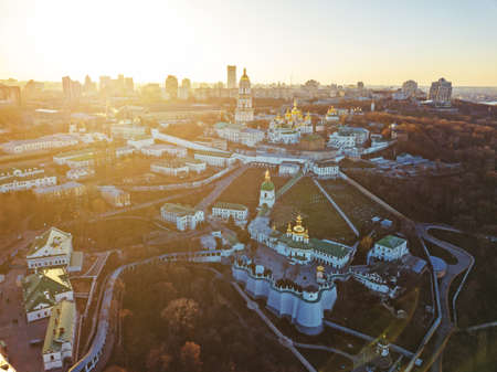 Aerial top view of Kiev Pechersk Lavra at sunrise, Kyiv, Ukraine