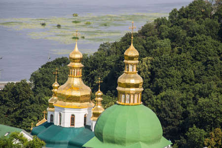 Cupola of Refectory Church of Kyiv Pechersk Lavra monastery. Dnieper river and residential areas on the left side of the river, Kyiv, Ukraine. high angle view.