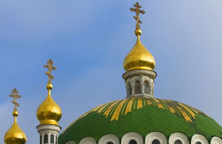 golden domes and a cross of the Orthodox Church against the blue sky, on a warm summer day Ukraine, Kiev