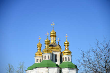 church architecture. orthodox temple. domes and crosses. bell tower. Orthodox Cathedral. Kiev-Pechersky monastery.