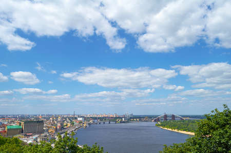 Kyiv, Ukraine 07.11. View of the Dnieper River and the city of Kyiv, Ukraine, from the pedestrian bridge on a sunny summer morning