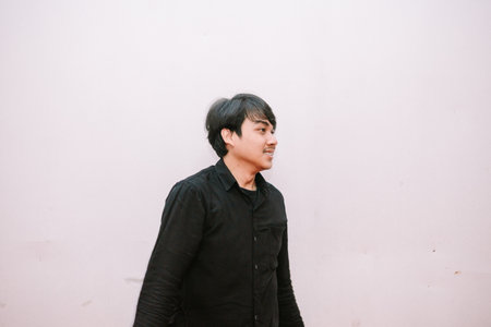 Asian man stands in front of black Zince background with the confident mood.