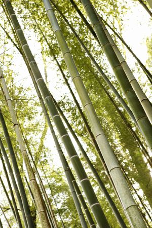 Low-angle perspective of a bamboo forest, the towering green stalks extending toward a bright sky, filling the frame with natural beauty