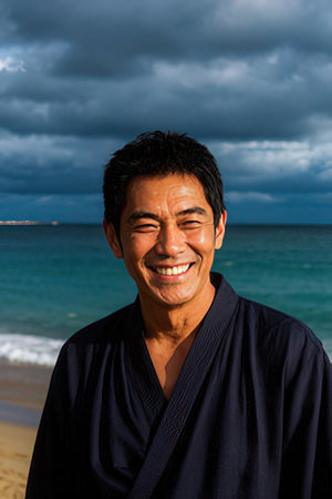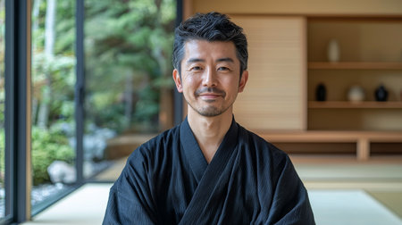 A confident middle-aged Japanese man wearing a black kimono looks calmly at the camera. He is sitting in a traditional room with shoji screens.