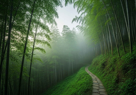 Peaceful bamboo forest with tall, slender stalks reaching towards the sky