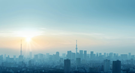 Morning light casts a warm glow over the Tokyo skyline, highlighting the iconic Tokyo Tower amidst a sea of skyscrapers. The atmosphere is serene with a soft blue hue enveloping the city.