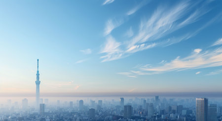 The Tokyo skyline glows softly in the early morning light, dominated by a tall tower. Wispy clouds stretch across a clear blue sky, creating a serene atmosphere over the bustling city.