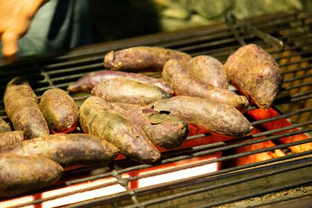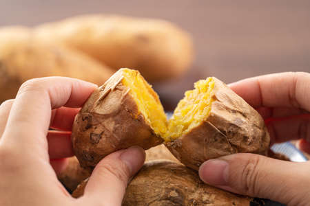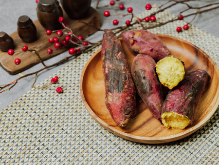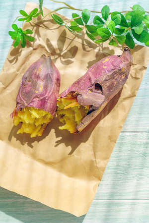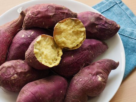 Close up of homemade delicious roasted sweet potato in a plate for eating, famous Taiwanese food.