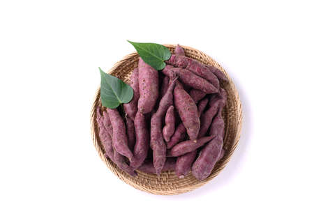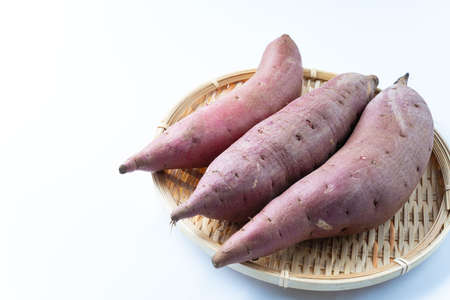 Organic raw white sweet potatoes from local farmer market in basket on white table