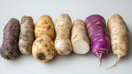 Discover a stunning array of fresh root vegetables showcasing various colors and textures. Perfect for culinary use and healthy eating.