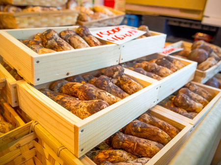 OSAKA, JAPAN - JULY 18, 2017: Fresh root are sold along the street at Kuromon Ichiba market, Nipponbashi, Osaka, Japan