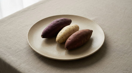Purple sweet potatoes on a plate on a table with a linen tablecloth