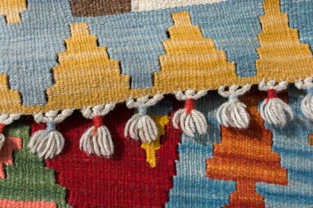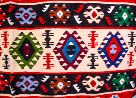 Ornament of traditional Ukrainian multicolored colorful rug. Hutsul ethnic woven smooth hand-woven wool rug with geometric ornaments background and texture. Detail of authentic local motif carpet.