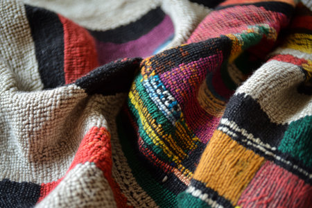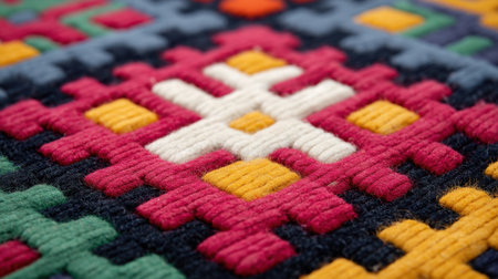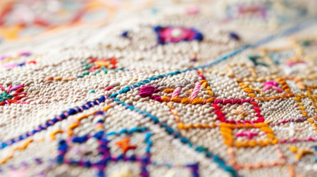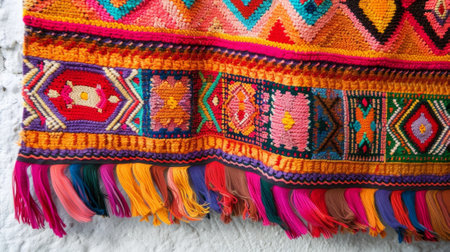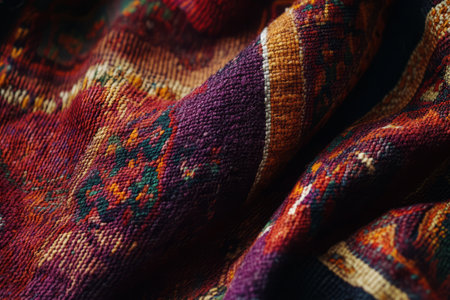This captivating close-up image showcases intricate textures and vibrant colors in traditional textiles, highlighting exceptional craftsmanship and artistry.