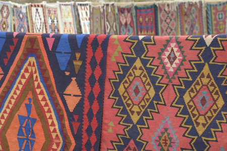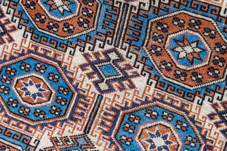 Close-up of Iranian rugs in different colors and patterns. Geometric patterns on.