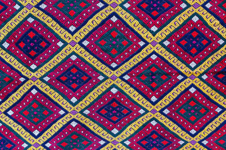 This close-up image highlights a colorful geometric textile pattern, emphasizing its vibrant hues and intricate details, ideal for design and decor inspiration.